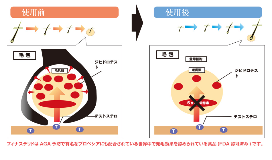 5αリダクターゼの働きを阻止し、ジヒドロテストステロン(DHT)の生成を強力に抑制するのがフィナステリド。ジヒドロテストステロン(DHT)が生成されなければ脱毛信号は発せられず、脱毛にはいたりません。